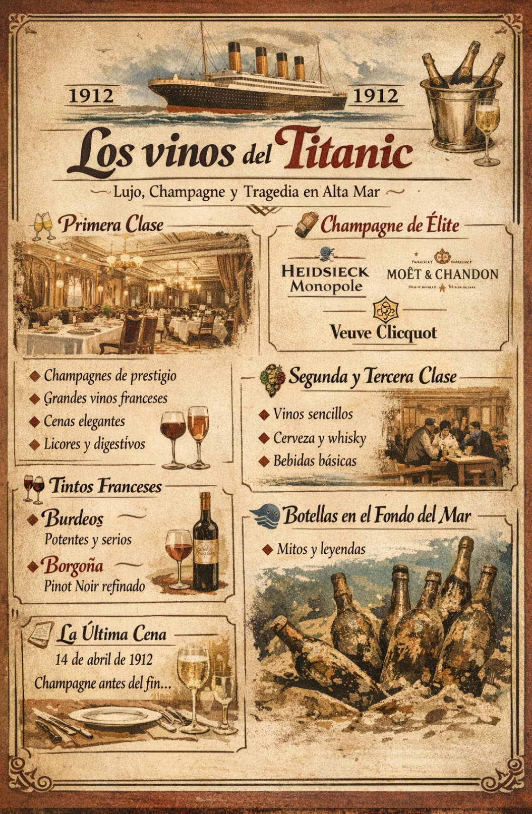 Hay historias que huelen a sal, a hierro, a noche fría…y también, curiosamente, a champagne francés.Porque el Titanic no solo fue el barco más famoso del siglo XX. Fue también un auténtico palacio flotante, donde el vino no era un detalle: era parte del espectáculo. ¿Qué vinos se bebían en el Titanic?🥂 Un transatlántico con bodega de gran hotel Abril de 1912. El Titanic zarpa rumbo a Nueva York.Y en sus entrañas no solo viajaban pasajeros… también viajaban miles de botellas.En primera clase, el vino era sinónimo de lujo:Cenas interminables con varios serviciosCopas de cristal finoChampagnes de prestigioBurdeos elegantesLicores para cerrar la nocheEl Titanic era, en realidad, un restaurante de…