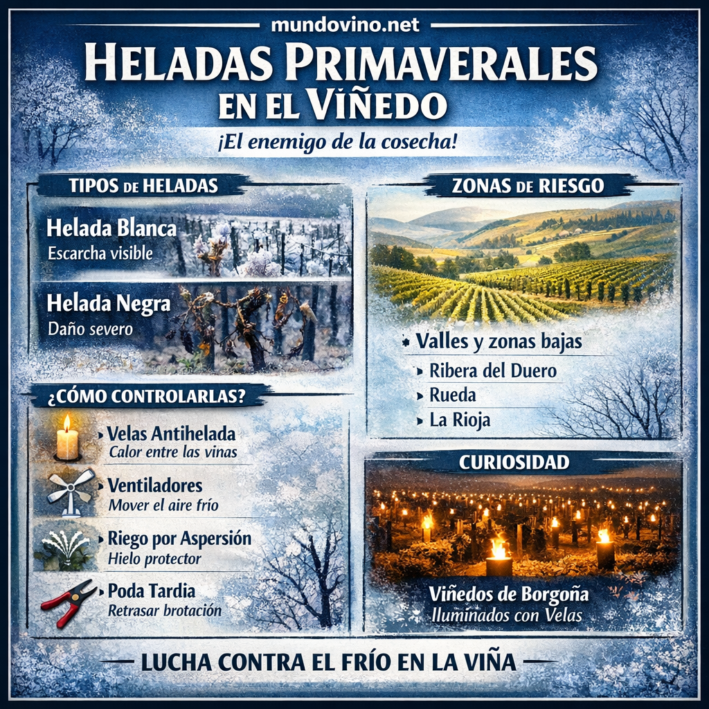 La primavera trae vida al viñedo. Los primeros brotes verdes asoman tras el reposo invernal y la vid despierta con toda la promesa de una nueva añada. Sin embargo, también llega uno de los momentos más delicados del año: las heladas primaverales. Una sola noche con temperaturas bajo cero puede comprometer meses de trabajo y marcar el carácter —o incluso el volumen— de la vendimia. ¿Por qué son tan peligrosas?A diferencia de las heladas de invierno, que afectan a la vid en reposo, las primaverales llegan cuando la planta ya ha comenzado su brotación.En esta fase, los tejidos jóvenes están llenos de agua y son extremadamente sensibles. Cuando la temperatura…