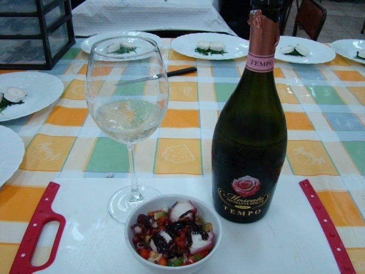 Empezamos con el 1º plato Salpicon de pulpo con granada y crema de balsamico:Vino Tempo Moscato d,Asti