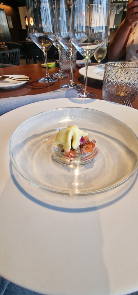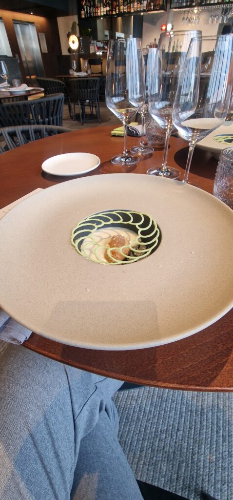 El recorrido comenzó con una almeja con espuma de leche de tigre, un entrante refrescante y elegante que fue acompañado por un Fino Jarana (Palomino fino – D.O. Jerez), cuyas notas punzantes y salinas potenciaron la vivacidad del plato.