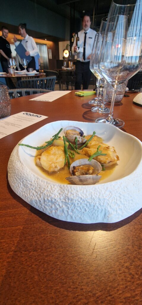 En la cuarta etapa, el equipo de cocina presentó un suquet de rape con almejas y algas al estilo Dagma, fiel a la tradición mediterránea pero con un toque contemporáneo. Este fue acompañado por un sorprendente La Vicalanda (Tempranillo blanco – D.O.Ca Rioja), un blanco poco convencional con cuerpo, notas frutales y una ligera barrica que maridó magistralmente con la profundidad marina del suquet.