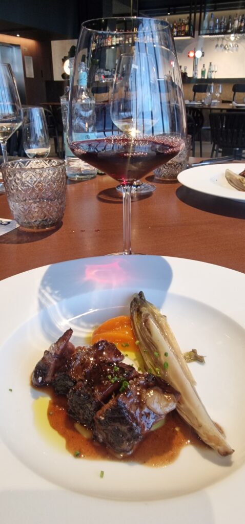 El plato fuerte de carne, una costilla de vaca cocinada a baja temperatura con romero y miel, patata fondant y endivia braseada, fue una obra de cocción lenta y sabores profundos. El vino seleccionado para este pase fue un Matas Altas (Monastrell – D.O. Jumilla), robusto, con taninos integrados y una fruta negra madura que acompañó con fuerza y elegancia a la potencia del plato.