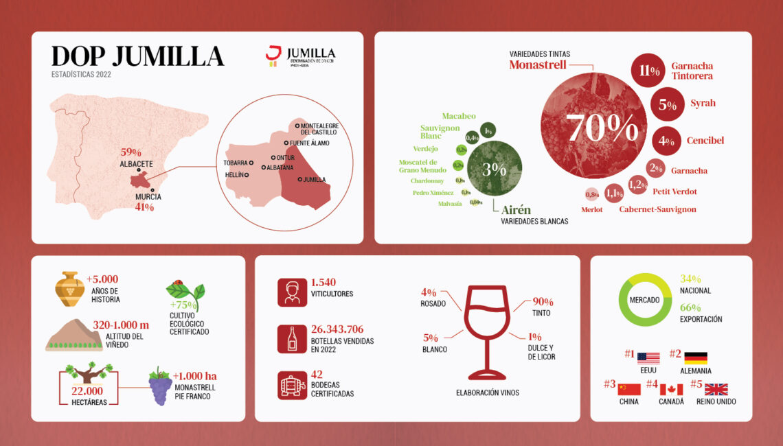 Los datos demuestran la clara vocación exportadora de esta histórica denominación de origen, con un 66% de las ventas. Sin embargo, España continúa siendo el principal mercado del vino DOP Jumilla, con un 34% de cuota de mercado, y con un crecimiento de todas las tipologías de vinos amparados: blancos, rosados, tintos, dulces y de licor.