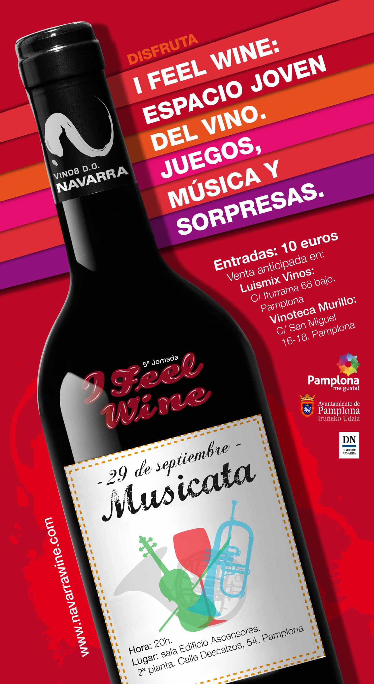 El consejo regulador de Navarra presenta uan propuesta diferente y original denominado “Musicata”. Son cuatro ritmos musicales con cuatro vinos diferentes… acompañados de cuatro tapas elaboradas especialmente para cada movimiento. Una manera de aprender algo más sobre el vino con todos los sentidos. Si estás interesado, puedes echar un vistazo al cartel que adjuntamos.