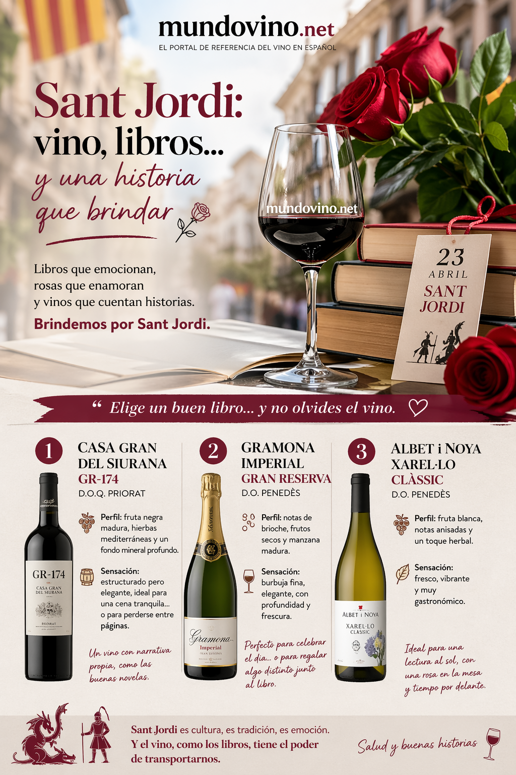 La leyenda de Sant Jordi —el caballero que venció al dragón y de cuya sangre brotó una rosa— sigue viva en cada brindis. Y en el mundo del vino, esa mezcla de épica, territorio y emoción tiene mucho sentido.