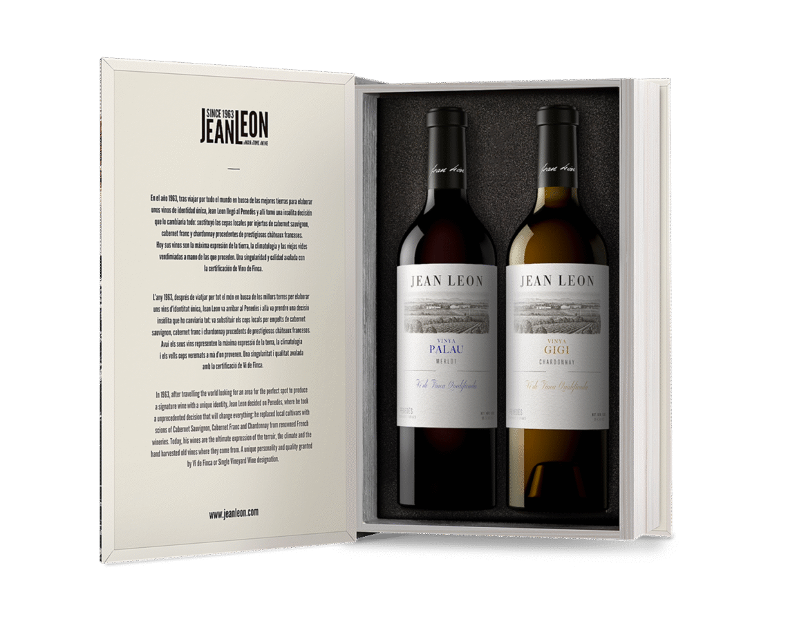 | Jean Leon propone celebrar el Día del Libro, el próximo 23 de abril, con un regalo original, pensado especialmente para los amantes del vino. Se trata de un estuche en forma de libro que atesora dos de los vinos más emblemáticos de la bodega del Penedès, Jean Leon Vinya Gigi Chardonnay 2023 y Jean Leon Vinya Palau Merlot 2020. Un regalo idóneo para los amantes del vino para este Día del Libro, que nace de la estrecha vinculación que siempre ha mantenido Jean Leon con el mundo de la cultura y de las artes.El estuche, con una cubierta en blanco y negro que muestra la bodega y los viñedos que lo rodean, se abre como un libro. En el interior, se puede leer una breve explicación sobre los inicios de la bodega el 1963 y la distinción de Vino de Finca Calificada que ostentan los dos vinos protagonistas. |