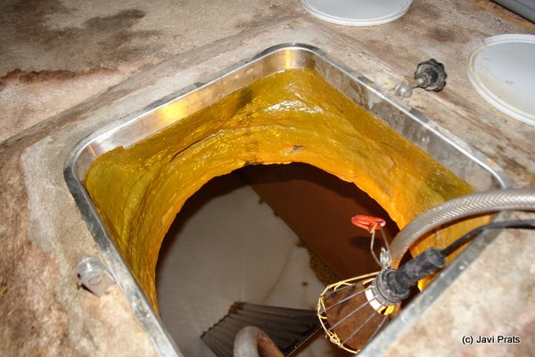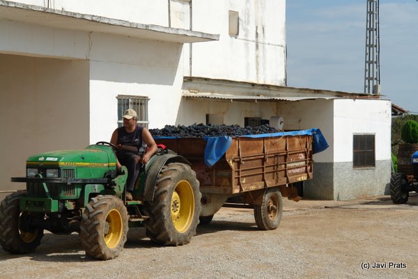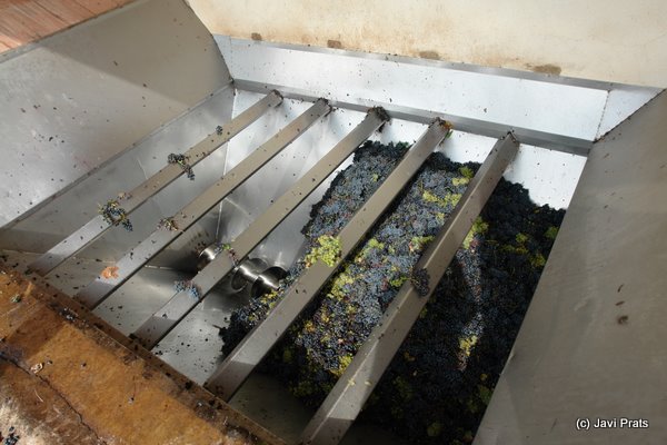 Hoy nos hemos encontrado a la bodega en plena vendimia, allí en la tolva iban descargando los tractotes uva Tempranillo, ya que es la única de recepción de uva de la bodega. Esta pasa a la despalilladora que por bombeo envía la pasta a los depósitos de 50.000 lts. de acero inoxidable y control de temperatura, donde macerarán para posteriormente pasarlos a los trullos o depósitos subterráneos donde fermentan.