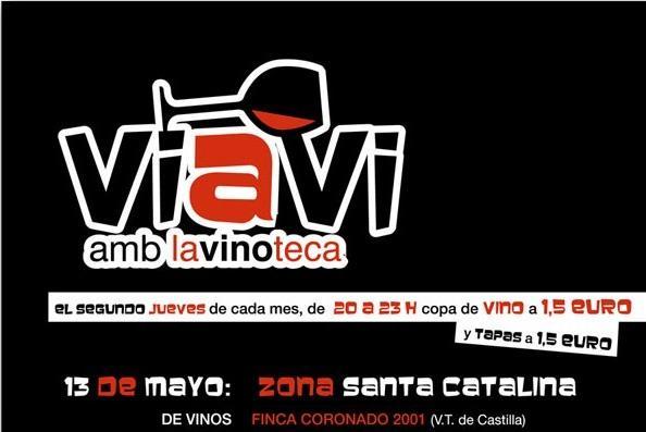 Os informo que el próximo Jueve,día 13 de Mayo, a partir de las 20:00 horas,tenemos en nuestra zona, Santa Catalina, la ruta del vino «Vi a Vi», un vino por 1.50 € y un montadito/tapa por 1.50 €,el vino que serviremos será el Finca Coronado 2001 de V.T.Castilla.